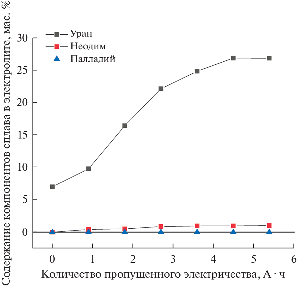At the reprocessing module of the pilot demonstration power complex site of the Siberian Chemical Combine, a combined technological scheme for the reprocessing of mixed nitride uranium-plutonium spent fuel consisting of pyrochemical operations, hydrometallurgical refining of uranium, plutonium and neptunium is implemented step by step. According to this scheme, the target pyrochemical reprocessing products, purified from the main mass of fission products with actinoid content not less than 99.9%, are sent for hydrometallurgical reprocessing. For pyrochemical reprocessing it is necessary to develop a technology of electrorefining of metallised spent nuclear fuel. To carry out electrolytic refining it is necessary to define processes and regimes of anodic dissolution of alloys simulating product of this head operation “metallization”. In the present work the results of investigations of processes of anodic dissolution of U–Pd and U–Pd–Nd model alloys with different concentrations of palladium and neodymium in melts based on 3LiCl–2KCl–UCl3 (10.1 wt % UCl3) at 550°C using different methods are presented. Uranium alloys containing palladium and neodymium were prepared by direct alloying of uranium metal and palladium metal powders of PdAP-1 grade, and neodymium metal (99.99%) in high-purity argon medium (99.998%). Electrochemical measurements were performed using an Autolab 302N potentiostat/halvanostat equipped with a Booster 20A high-current module. The anodic polarisation curves consist of only one oxidation wave which was attributed to the dissolution of uranium metal. Increasing the palladium content in the alloy from 1.5 to 10.0 wt %, does not affect the shape of the polarisation curves. The increase of neodymium content in the alloy from 1.0 to 10.0 wt % also does not affect the shape of polarization curves. Electrorefining parameters of uranium alloys containing palladium and neodymium were determined. The limiting current density of uranium evolution from uranium alloys containing palladium and neodymium in the electrolyte 3LiCl–2KCl–UCl3 (10.1 wt % UCl3) at 550°C was 0.4 A/cm2. It was shown that palladium does not diffuse into the melt as a result of anodic dissolution and neodymium accumulates in the electrolyte only when the alloy is refined with 10.0 wt % neodymium, which is much higher than the future real concentrations of electrotreated uranium alloy components in the technological chain of spent nuclear fuel processing.
