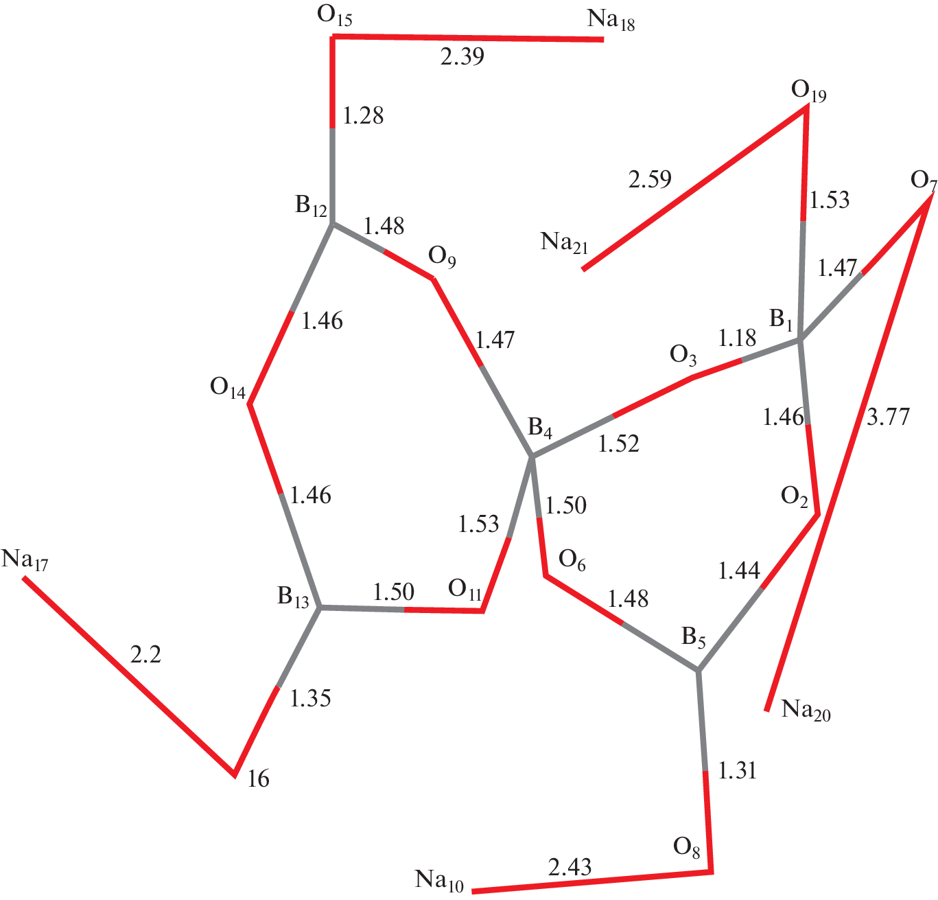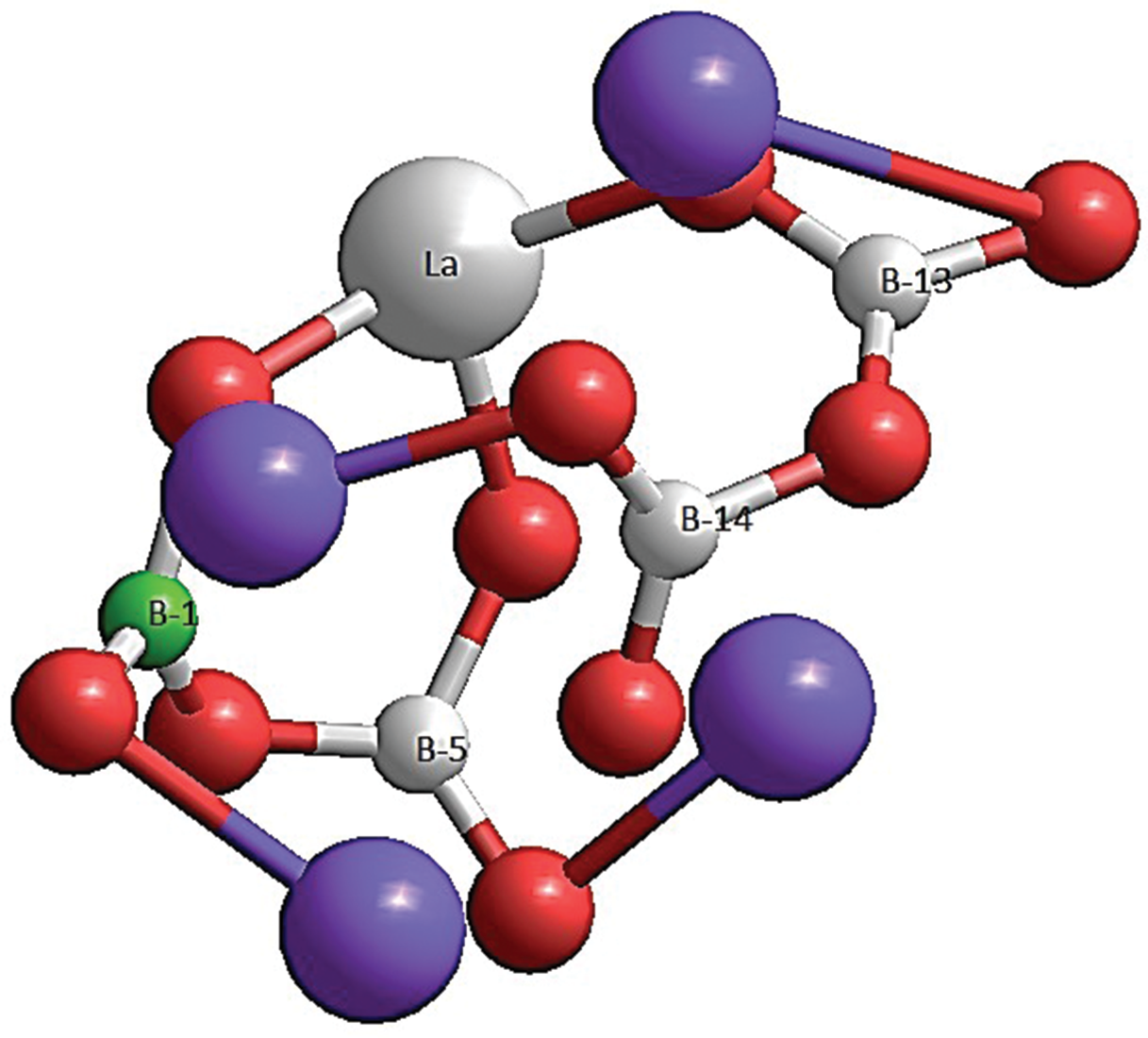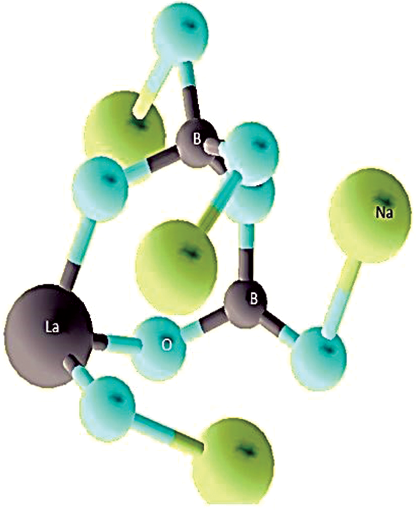 It shows a significant change in structurally sensitive properties in the experiment of modifying a melt (or glass) of the B2O3–Na2O system with lanthanum oxide La2O3 with the destruction of superstructural units when lanthanum atoms hit, since small additions of rare earth metal oxides lead to a significant change in the properties of alkali borate melts. Molecular models of some of the superstructural units, the structure and properties of which were calculated by semi-empirical quantum chemical methods with MNDO and PM7 parameters: as a result of the optimization procedure, both methods lead to models that are qualitatively close, but differ in bond lengths, and practically the same value of heat of formation. The superstructural unit of the considered type is preserved, while its characteristics change: the volume occupied by it increases, the newly formed bond is less strong and its ionic degree is greater.