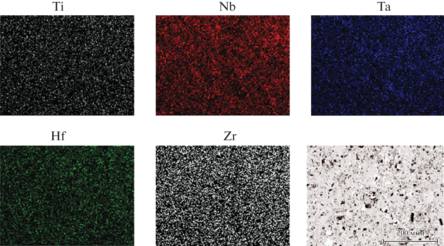 Карбиды тугоплавких металлов TiC, ZrC, HfC, NbC и TaC обладают превосходными физическими, химическими и механическими свойствами в качестве материалов для ультравысокотемпературной керамики. Из них наиболее тугоплавкими являются TaC и HfC, температуры плавления которых приближаются к 4000°C. Нельзя не отметить высокую твердость, прочность и износостойкость тугоплавких карбидов. Отсюда вытекает закономерный интерес к высокоэнтропийным карбидам на их основе, которые становятся важным классом новых керамических материалов, поскольку потенциально обладают более совершенными прикладными свойствами. Однако получение таких материалов классическими металлургическими методами является сложной задачей. В современных исследованиях чаще всего образцы высокоэнтропийных карбидов синтезируют, используя дорогостоящее специальное оборудование (методы плазменно-искрового спекания, высокоэнергетические планетарные мельницы и т.п.) и сравнительно длительную подготовку прекурсоров к производству образцов. В настоящей работе описывается новый подход к синтезу многокомпонентного карбида состава (Ti0.2Zr0.2Hf0.2Nb0.2Ta0.2)C с помощью электрохимического процесса при температуре, не превышающей 1173 K. Метод основан на явлении бестокового переноса металлов в расплавах солей. После проведения последовательного переноса металлов образец отмывался от электролита, затем спекался в вакуумной печи. По данным рентгенофазового анализа полученный высокоэнтропийный карбид представляет собой однофазный твердый раствор с ГЦК структурой. Дифрактограмма синтезированного образца имеет хорошее согласие с расчетной дифрактограммой, полученной по формуле Дебая для суперячейки из 64000 атомов. Компактный образец высокоэнтропийного карбида изготавливался прессованием в пресс-форме таблетки диаметром 10 мм с добавлением кобальта в качестве матричного металла. После вакуумного спекания образец подвергался шлифовке для подготовки к исследованию на сканирующем электронном микроскопе. Было выполнено элементное картирование поверхности образца, которое показало удовлетворительное распределение металлов, входящих в состав высокоэнтропийного карбида. Измеренная микротвердость образца оказалась меньше, чем встречающиеся значения в публикациях других авторов, что может быть связано с некоторой остаточной пористостью образца.