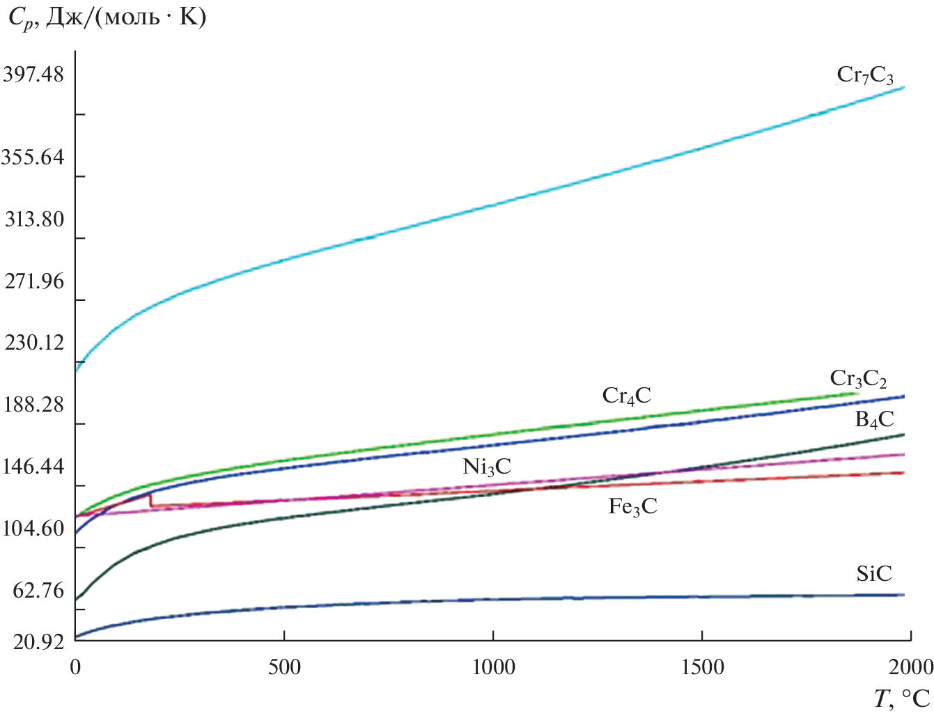 To determine thermochemical characteristics: enthalpy, molar heat capacity and Gibbs energy of formation of silicides, borides and carbides in an alloy of a given composition (40Fe–31Ni–16Cr–5Cu–5Si–2B–1C) calculation methods were used using mixed GGA and GGA + U schemes (semi-empirically tuned generalized gradient approximations). Three modules of the HSC Chemistry 6.0 software package (Metso Outotec, version 6.0, Espoo, Finland) were used in the study. First, the “Reaction Equation” module was used to calculate the change in Gibbs free energy at different temperatures. Secondly, to calculate the composition of each chemical in the equilibrium state, the module “Equilibrium Composition” was used (“Equilibrium compositions” – calculation of equilibrium compositions of phases in the presence of reversible chemical reactions). Thirdly, the module “H, S, C and G diagrams” (“Graphs of thermodynamic functions” – plotting thermodynamic functions) was used to determine the relative phase stability of compounds depending on temperature in the form of Ellingham diagrams. The results of thermochemical modeling showed that the temperature dependences of the heat capacity of the formation of hardening compounds in the alloy increase with increasing temperature. Thermodynamic calculations of the enthalpies of the hardening phases in the alloy showed that at temperatures >1400°C, silicides, borides, and carbides are formed. ∆G(T) of silicides, there is an increase in the values of the Gibbs energy and a tendency towards stability with increasing temperature. During the formation of borides in the alloy, one can see a strong absorption of heat, an increase in the Gibbs energy in the studied temperature range. The results of calculating the Gibbs energy as a function of temperature showed the formation of carbides Ni3C, Fe3C, SiC, B4C, Cr3C2, Cr4C, Cr7C3. The formation of phases occurs with a decrease in the values of the Gibbs energy to a temperature of ~1500°C. A further increase in temperature indicates the absorption of heat, which is associated with a high ordering temperature of the carbide structures. Thus, the thermochemical study justified the formation of silicides, borides, carbides in the alloy 40Fe–31Ni–16Cr–5Cu–5Si–2B–1C.