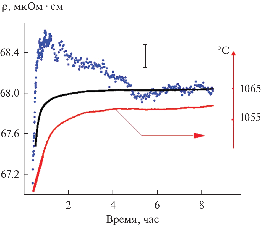 Long-term relaxation of large–scale inhomogeneities in aluminum – rare earth metal melts with a content of the latter in the range of 5–10 at % was previously observed when measuring viscosity and density, but did not manifest itself when measuring electrical resistance and magnetic susceptibility. This behavior could be related both to the specifics of the measured properties and to the size of the samples, which in the case of viscosity and density is much larger: 12–15 g with a diameter of a cylindrical crucible ~15 mm for viscosity and density, and less than 1 g with a crucible diameter of 6 and 4 mm for electrical resistance and magnetic susceptibility, respectively. To solve this problem, the time dependences of the electrical resistance of the Al91La9 melt were measured at 1060°C for samples of various sizes by the rotating magnetic field method, namely for standard (crucible diameter of 6 mm) and enlarged (crucible diameter of 10.5 mm) When the sample increases, the random measurement error increases, so additional measures had to be taken to stabilize the current in the coils, creating this field. It was found that with an increase in the mass of the sample to 2.15 g with a crucible diameter of 10.5 mm the large-scale heterogeneity that occurs during the melting process is manifested. It is interpreted as a compact “cloud” of intermetallic microparticles surrounded by a melt with a high content of REM. The sample relaxes to an equilibrium homogeneous state in a few hours. To speed up the process, additional exposure is required – heating to a high temperature, about 1500°C, which reduces the time to less than one minute. At the same time, in small (0.7 g with a crucible diameter of 6 mm) samples, the mentioned heterogeneity does not occur. The probable cause of the inhomogeneity is the flow of REM atoms to the surface and the reverse flow of aluminum atoms into the volume during crystallization, which is similar to liquation during the crystallization of cast iron and steel. The measurements carried out allow us to estimate the scale of the resulting inhomogeneities, which corresponds to the size of the enlarged sample.