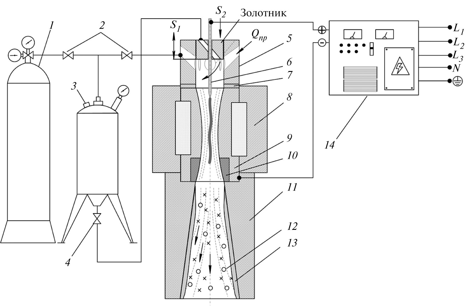 Рис. 1. Общая схема с элементами оборудования и устройством генирации потока плазмы: 1 — газовый балон; 2 — вентили подачи; 3 — бункер с материалом; 4 — вентиль подачи порошка; 5 — смеситель; 6 — катод; 7 — деэлектрическая вставка; 8 — теплообменник; 9 — сопло (концентратор); 10 — керамическая вставка; 11 — реакционная камера; 12 — поток смеси газа и парокапельной фазы; 13 — расплав на стенках камеры; 14 — инверторный источник тока.