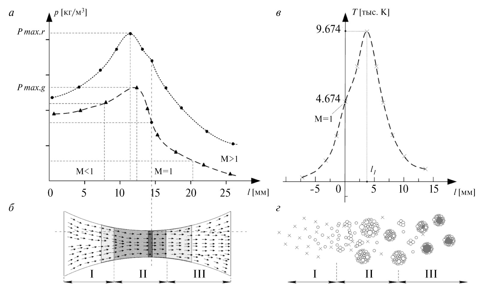 Особую сложность вызывает контроль параметров парокапельной фазы, образованной на участках I и II (см. рис. 2б). Однако можно руководствоваться результатами математического моделирования, результаты которого приведены в виде зависимостей плотности газовой смеси pg и парокапельной фазы pr от расстояния l — длины концентратора (см. рис. 2а). На рис. 2б показано направление движения и области изменения плотности потока газа. Однозначно установлено, что значение pmaxg < pmaxr, где значение плотности парокапельной фазы значительно выше значения плотности газа по всей длине концентратора. Расход газа через концентратор составляет ~ 35 л/мин, диаметр отверстия в сечении M = 1 составляет 4 мм, давление в магистрали перед плазмотроном — 1.3·107 Па.