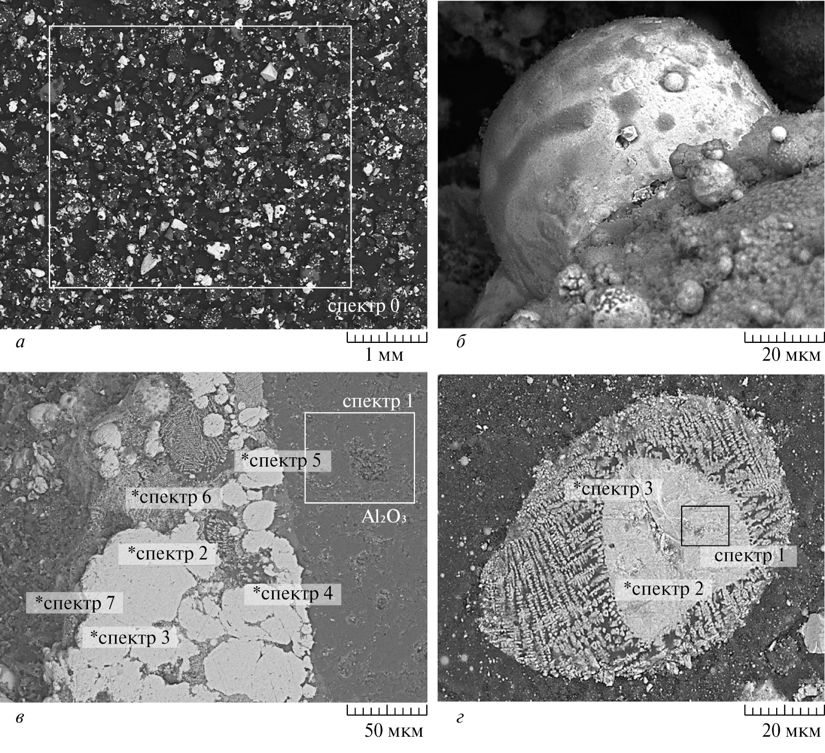 На рис. 3 представлены сферообразные частицы, сконденсированные в процессе охлаждения и удерживающиеся на внутренней поверхности керамической вставки. Можно отметить, что частицы делятся преимущественно на две группы — светло-серые, в состав которых входят соединения вольфрама и восстановленный вольфрам, и темно-серые, в состав которых входят соединения попутных химических элементов.