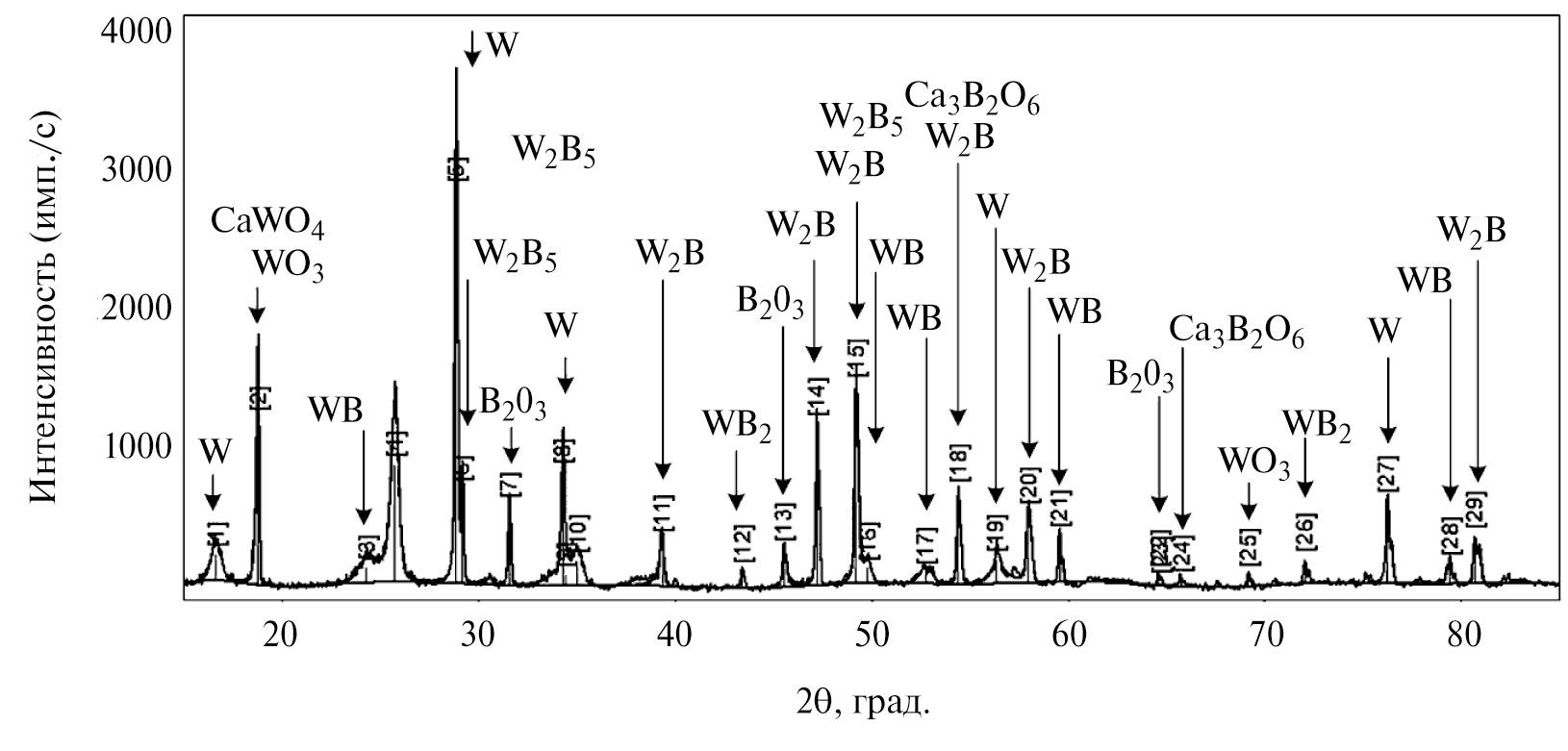 В ходе рентгеноспектрального исследования (рис. 4) установленно наличие металлического W и его боридов — W₂B₅, W₂B, WB, WB₂.