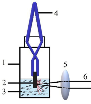 Рис. 2. Схема процесса лазерной абляции металлов в жидкости для получения НЧ-ВЭС: 1 – емкость с образцом; 2 – металл; 3 – растворитель; 4 – фиксирующий пинцет; 5 – линза; 6 – лазерный луч [63].