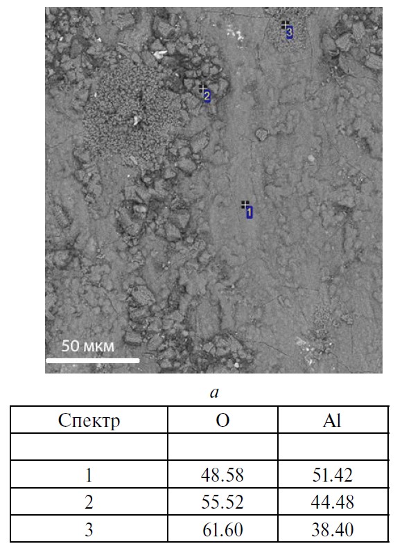 Рис. 4. Электронная микрофотография (а) и таблица содержаний алюминия и кислорода в различных точках оксидного покрытия на поверхности композита Al-10.1Al2O3 (мас.%), полученная по данным микрорентгеноспектрального анализа
