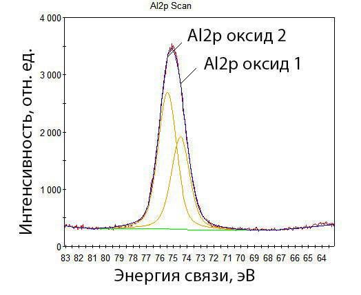 Разложение пика Al2p высокого разрешения образца алюминий-оксидного композита после коррозионного теста на пики с вершинами на 74.48 и 75.45 эВ (алюминий только в оксидной форме) (Рис. 7) показывает, что вся поверхность композита после теста покрыта равномерным слоем оксида. Коррозия носит равномерный характер, без образования питтингов.