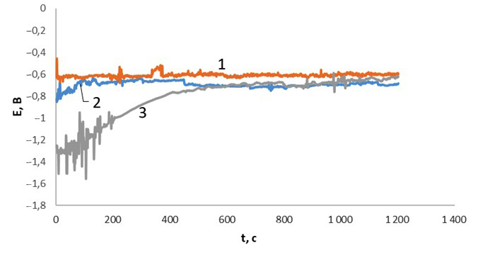 Рис. 8. Хронопотенциограммы исходного алюминия (1) и алюминиевых композитов, содержащих 2 – Al-13.5Al2O3 (мас.%) и 3 – Al-8.7Al2O3 (мас.%)в растворе 0.5М NaCl.