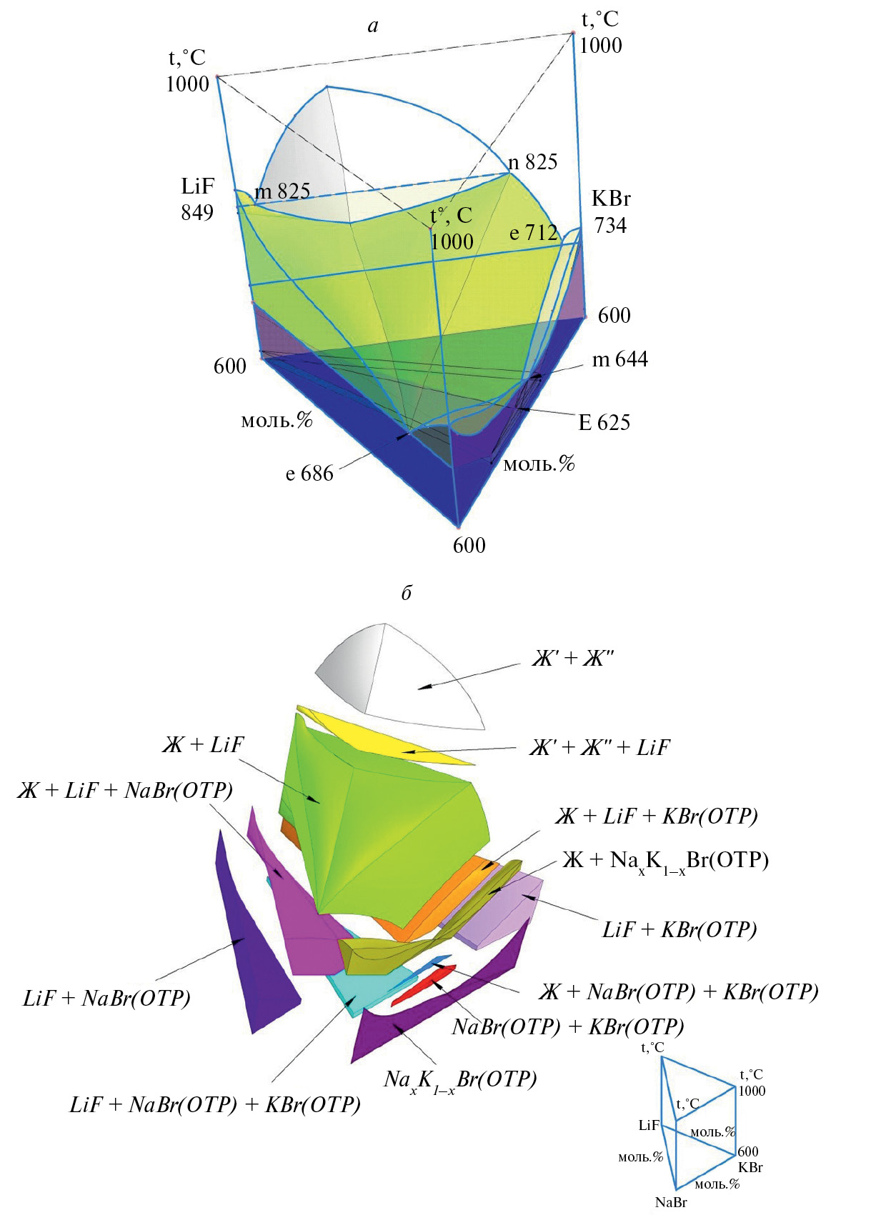 Квазитройная система LiF–NaBr–KBr является стабильным треугольником четырехкомпонентной взаимной системы Li+, Na+, K+ || F–, Br– (рис. 1). Используя данные по двойной (NaBr–KBr) и квазидвойным (LiF–KBr, LiF–NaBr) системам, изученным в [19], построена 3D-модель квазитройной системы (рис. 3). В стабильном треугольнике LiF–NaBr–KBr присутствуют три поверхности кристаллизации LiF, NaBr и KBr, которые пересекаются по трем моновариантным кривым, сходящимся в тройной эвтектике E612, а также область расслаивания жидких фаз [19].