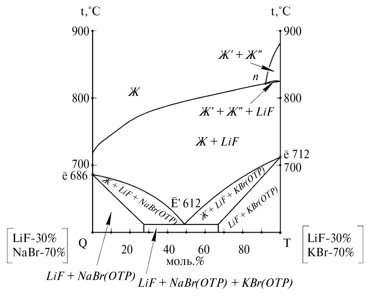 Построенные из 3D-модели T-x-диаграммы разрезов QT (рис. 4) и K1K2 (рис. 5) (линия конверсии K1–K2) имеют аналогичное строение и различаются только областями расслоения двух жидких фаз Ж′ + Ж′′. На диаграммах показан разрыв сплошности непрерывного ряда твердых растворов NaxK1-xBr с образованием квазитройной эвтектики, проекция которой на разрезах отмечена как 612. Отмечены на диаграммах выше ликвидуса однофазное поле жидкости, четыре двухфазных поля (Ж′ + Ж′′, Ж + LiF, LiF + NaBr(ОТР), KBr(ОТР) + LiF) и четыре трехфазных поля (Ж′ + Ж′′ + LiF, Ж + LiF + KBr(ОТР), Ж + LiF + NaBr(ОТР), NaBr(ОТР) + KBr(ОТР) + LiF)).