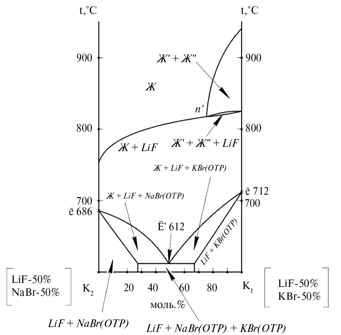 На кривой охлаждения первый экзоэффект при 644 оC отвечает ликвидусу в т. 1, как видно из схемы кристаллизации, приведенной на рис. 12, т. е. кристаллизации LiF, второй 623 оC и третий 603 оC экзоэффекты отвечают кристаллизации LiF + KBr(ОТР) и LiF + KBr(ОТР) + NaBr(ОТР) (рис. 10, 12). Фазы стабильного треугольника подтверждены данными РФА (рис. 11, 12) смеси 1 (линия K1–K2). Максимальное поле кристаллизации в стабильном треугольнике принадлежит фториду лития, в котором выделена область расслаивания двух жидких фаз Ж′ + Ж′′.