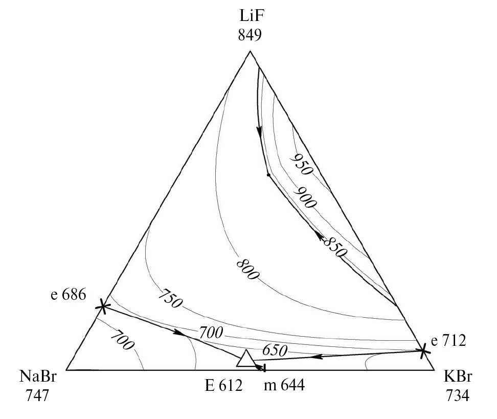 Применение расплавов из солей лития, натрия и калия в современных науке, технике и технологии связано с теплоаккумулирующими материалами [1, 2, 3], электролитами для химических источников тока [4–6], для жидкосолевых ядерных реакторов [7]. Применение расплавов в различных областях промышленности и научных исследованиях основано на изучении свойств расплавов и химических процессов, протекающих в них [8]. Расплавленные фториды находят применение в качестве жидкого топлива и теплоносителей в ядерно-энергетических системах [9]. Многие применяемые солевые смеси галогенидов включает два и более компонентов [10]. Для разработки перспективных в прикладном отношении низкоплавких сплавов необходима исчерпывающая информация о фазовых равновесиях с участием указанных солей [11]. Знания о термической стабильности солевых смесей повышают эффективность их применения [12, 13]. Целью настоящей работы является построение 3D-модели фазовых равновесных состояний квазитрехкомпонентной системы LiF-NaВr-KВr, входящей в четырехкомпонентную взаимную систему Li+, Na+, K+ || F–, Вr–, описание и исследование полей кристаллизации и реакции ионного обмена 2LiBr + NaF + KF = 2LiF + NaBr + KBr.