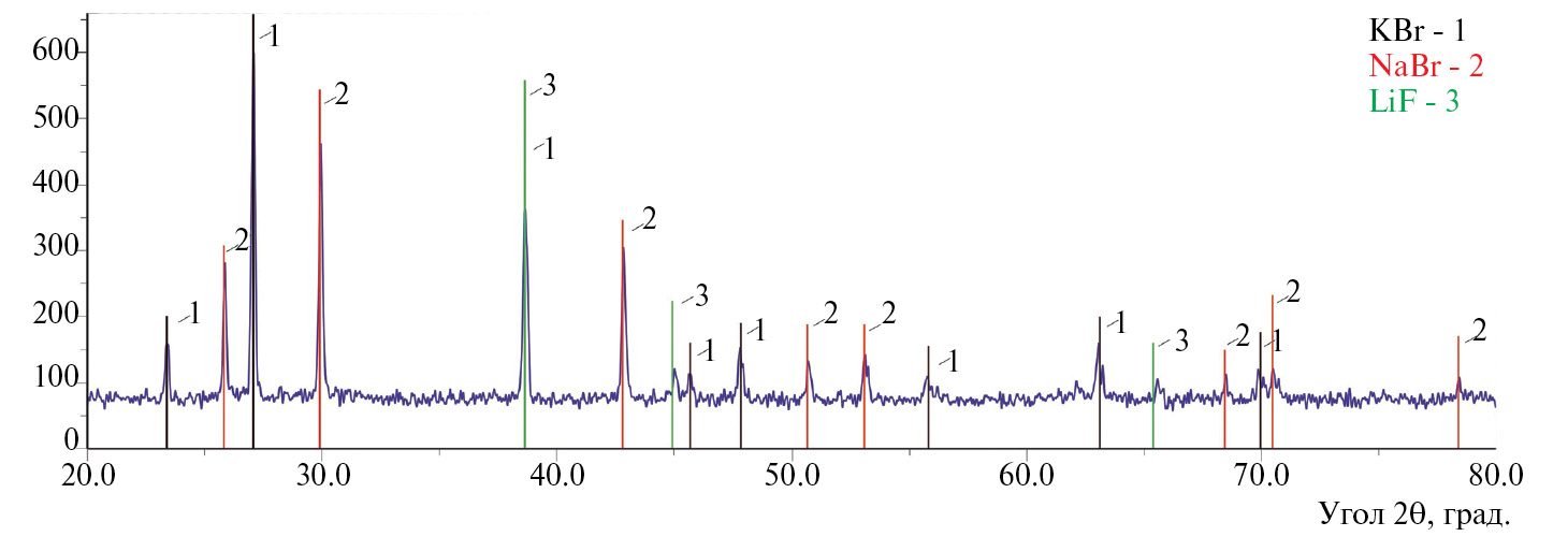 Рис. 11. Рентгенограмма образца состава 50% LiBr + 25% NaF + 25% KF (KBr PDF 01-072-1541; NaBr PDF 01-078-0761; LiF PDF 01-071-3743) .