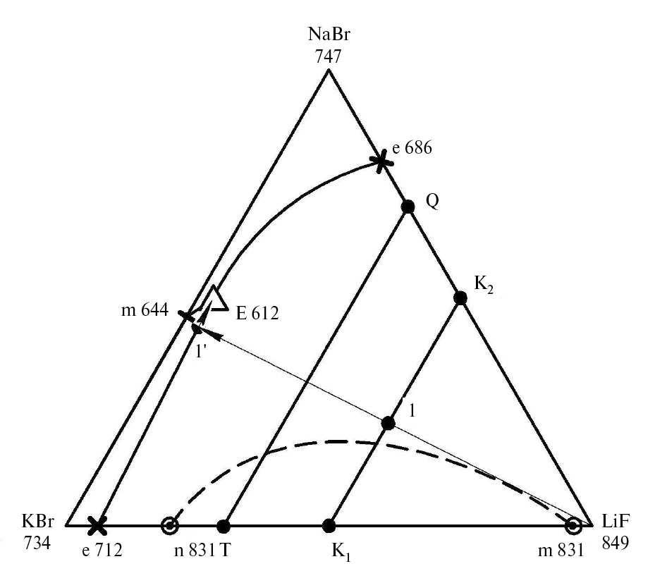 Рис. 12. Схема кристаллизации смеси 1 на линии конверсии К1–К2 в стабильном треугольнике LiF–NaBr–KBr.