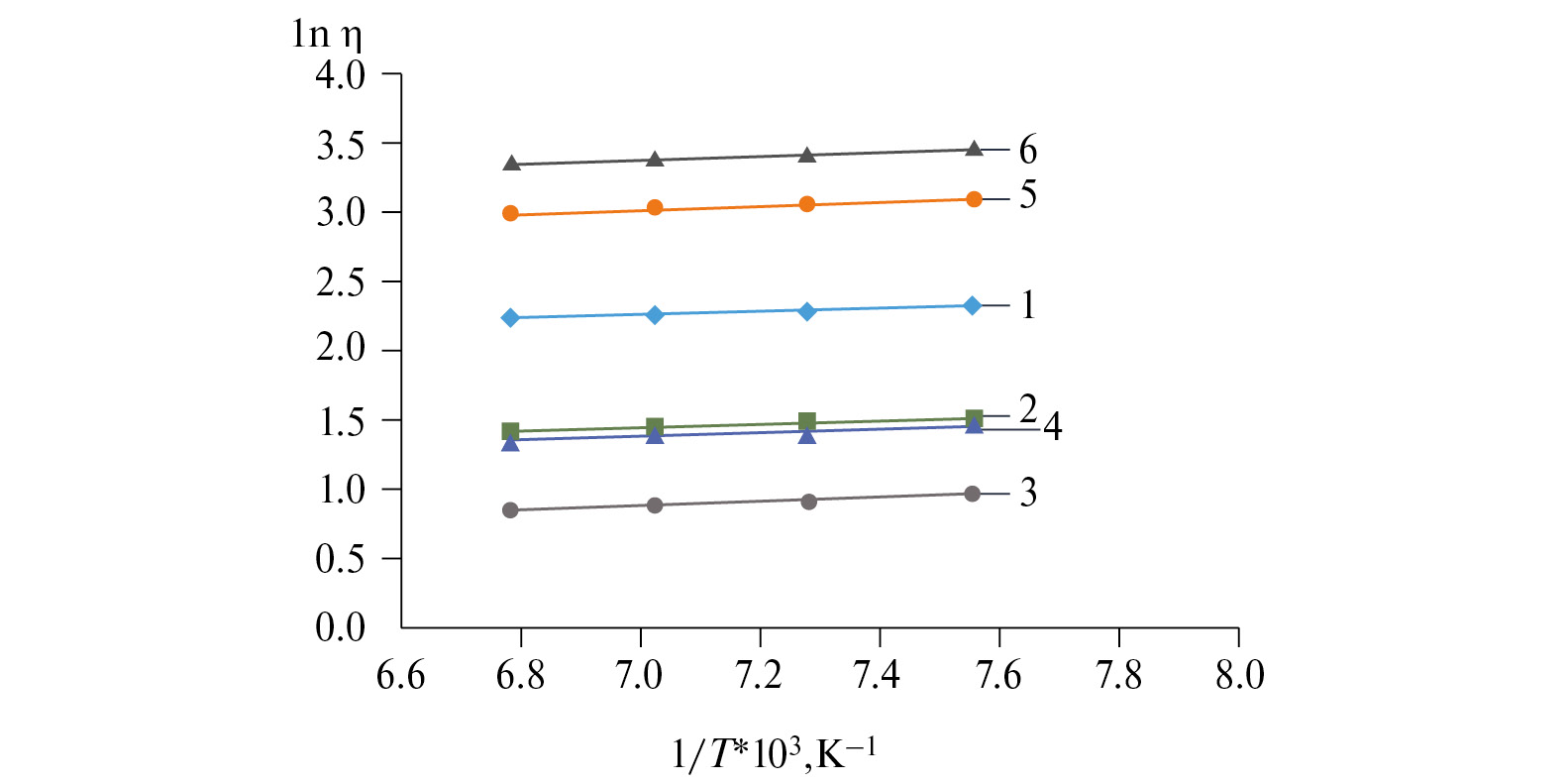 Рис. 2. Температурная зависимость динамической вязкости от концентрации сульфата кальция в расплаве, %: 1 – 0, 2 – 10, 3 – 20, 4 – 30, 5 – 40, 6 – 55.