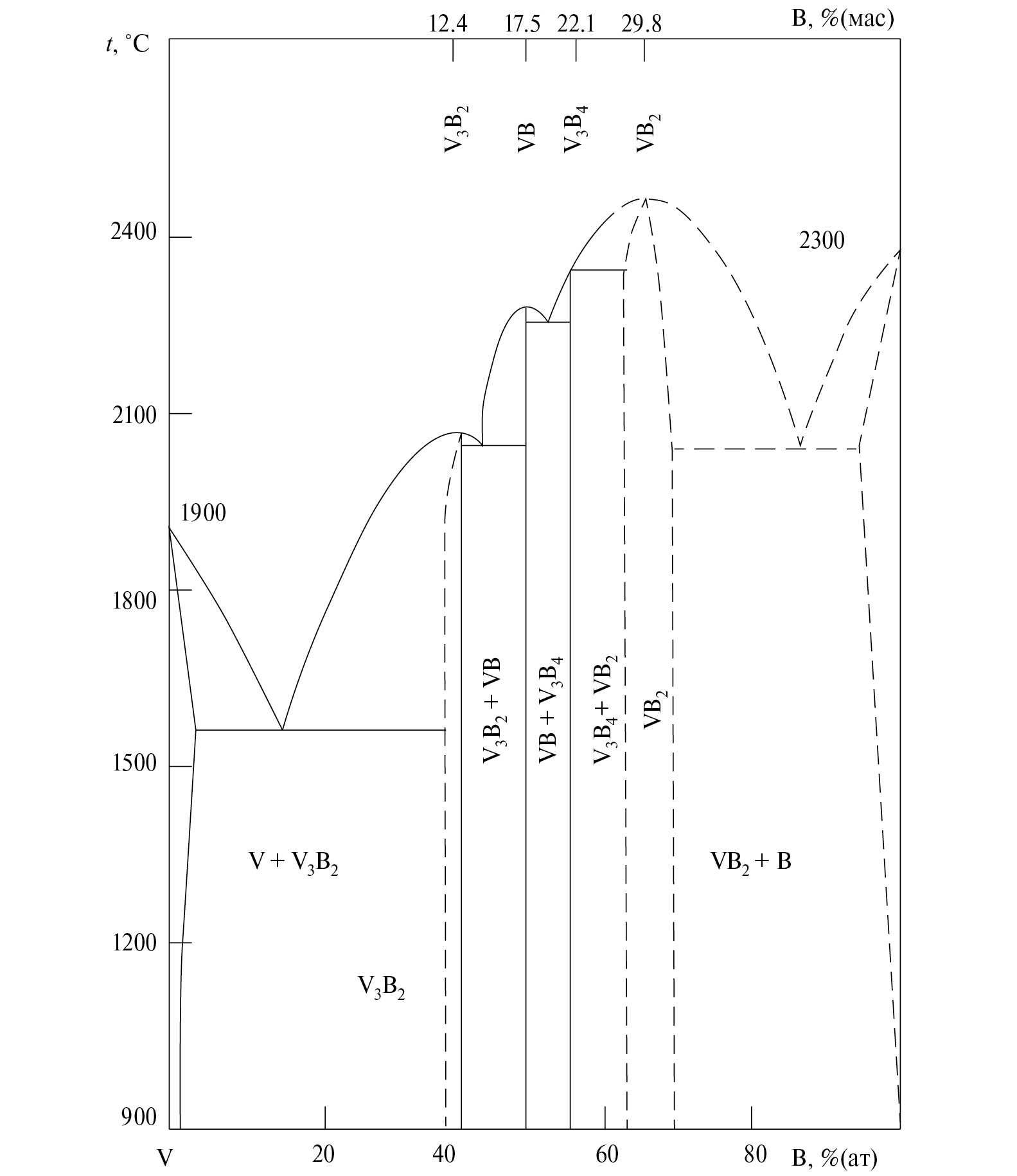 В работе [17] описано взаимодействие V с B. Согласно рис. 4 в системе V – B образуется шесть различных боридов ванадия: V3B2, VB, V5B6, V3B4, V2B4, VB2.