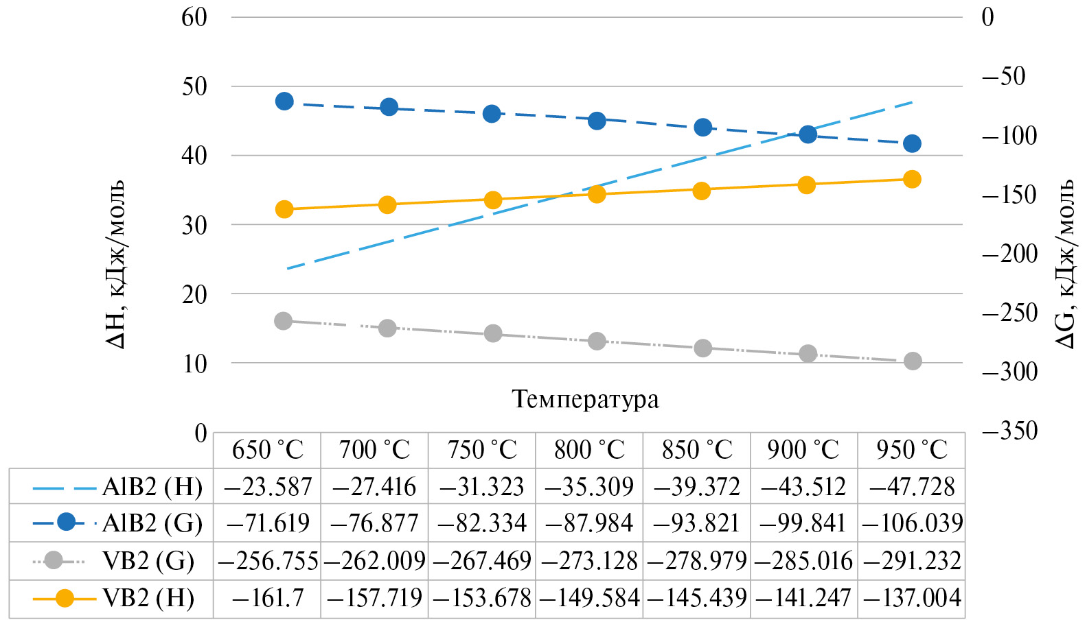 При температурах 650–950°С и атмосферном давлении изменение энергии Гиббса для соединений VВ2 составляет –256.755 и –291.232 кДж/моль, и AlB2 составляет –71.619 и –106.039 кДж/моль соответственно. Изменение энтальпии является величиной отрицательной для реакций диборида ванадия соответственно образование данного соединения носит экзотермический характер, образование диборида алюминия напротив носит эндотермический характер по причине положительной энтальпии.