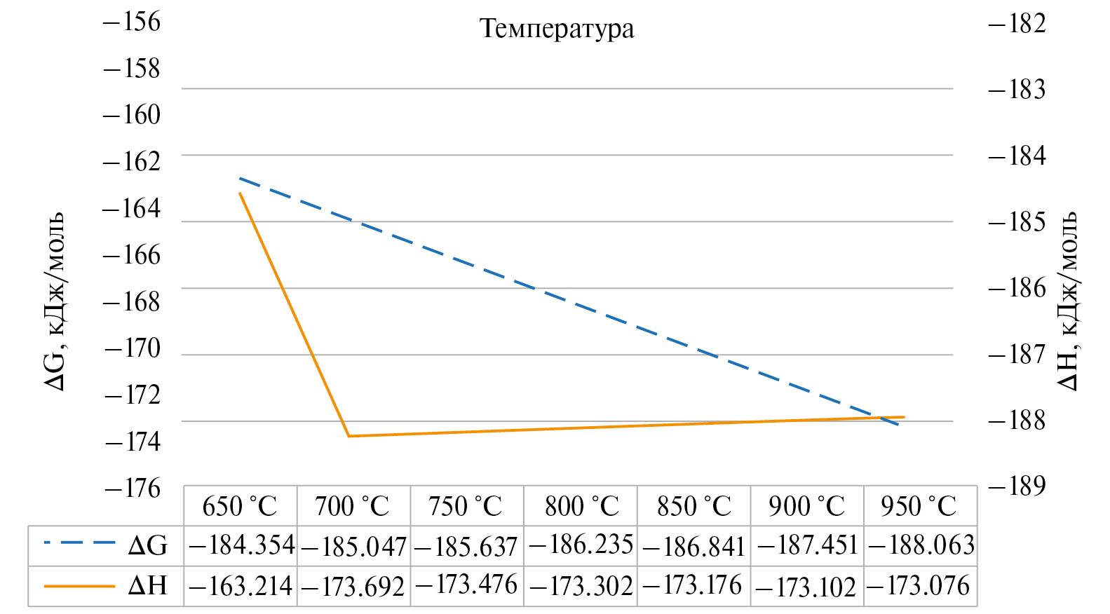Рис. 6. Зависимость изменения энергии Гиббса и энтальпии от температуры для реакции AlB2 + V = VB2 + Al.