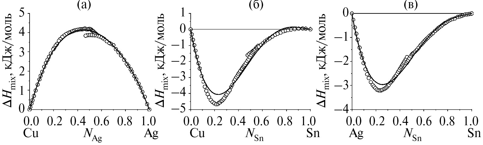 Рис. 1. Экспериментальные величины ΔHmix при 1423 К (точки) и их описания квазихимическим приближением модели субрегулярных растворов (сплошные линии) для двойных систем Cu-Ag (а), Cu-Sn (б) и Ag-Sn (в) [6, 7].