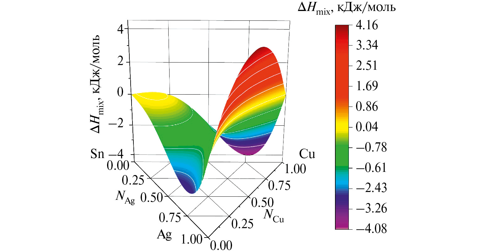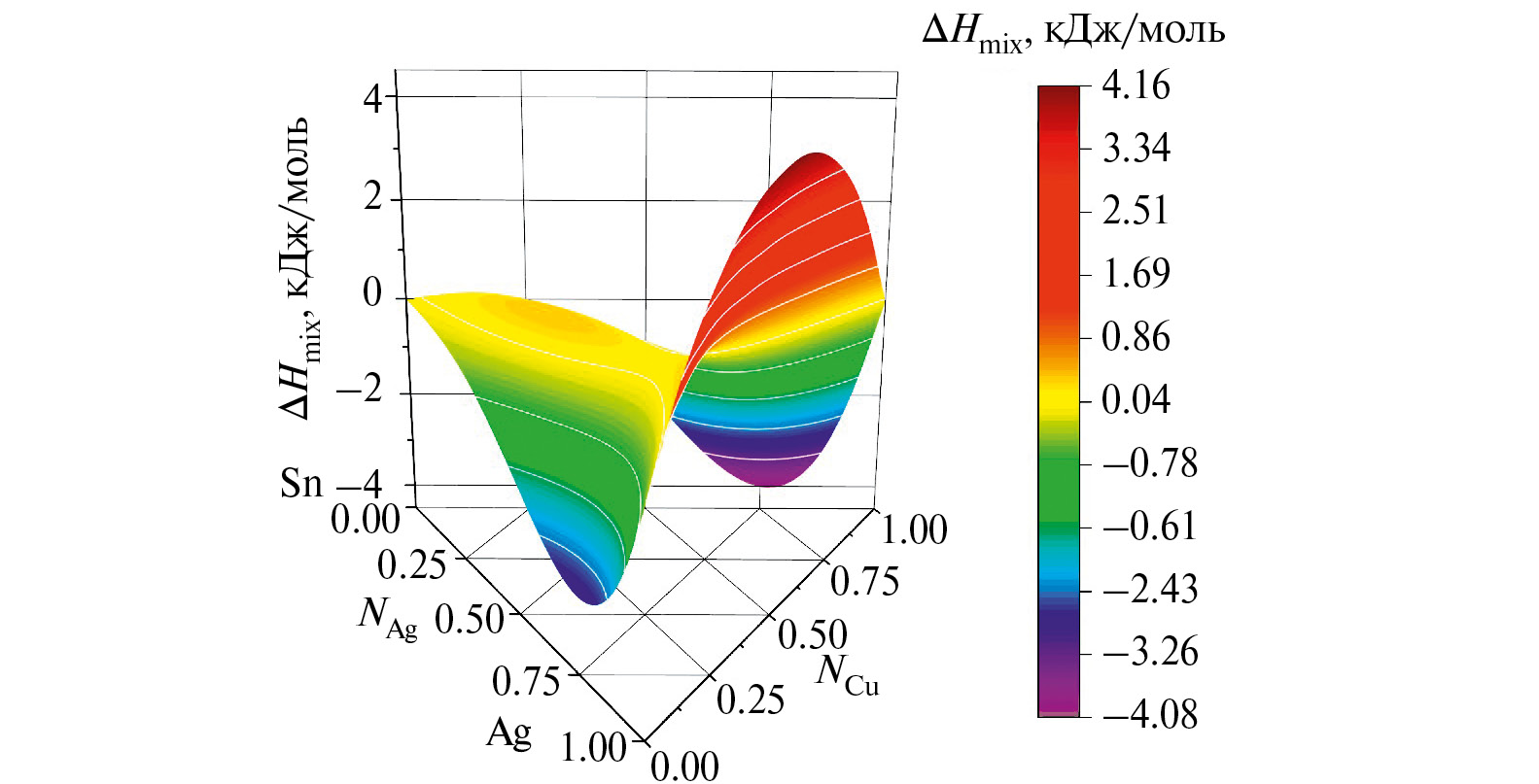 Для оценки энтальпии смешения расплавов тройной системы Sn-Ag-Cu использованы три геометрические модели (Toop, Kohler и Muggianu), различающиеся трактовкой составов бинарных подсистем, образующих трехкомпонентную композицию заданного состава. Разница в подходах изложена в [2].