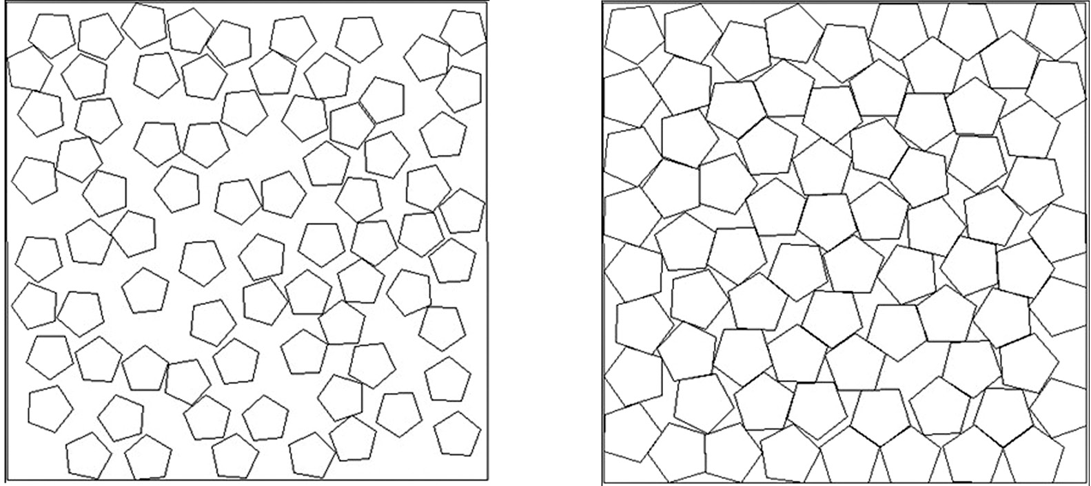 Свойства случайных ансамблей дисков и правильных многоугольников, полученных методом случайной последовательной адсорбции (RSA), были достаточно подробно изучены — например, в работах [13–20]. Алгоритм RSA включает размещение неперекрывающихся частиц со случайными координатами до «насыщения» поверхности. Этот алгоритм интуитивно понятен, хорошо запротоколирован и дает воспроизводимые результаты. Максимальные плотности упаковки для правильных пентагонов, полученные таким образом, составляют приблизительно 0.5413 [15] и практически не зависят от соотношения линейных размеров частиц и квадратного «бокса», в котором они размещаются, если это соотношение составляет менее 0.01 (что соответствует количеству частиц > 104).