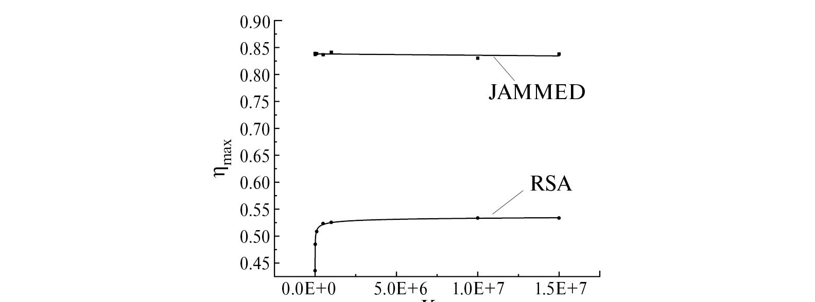 Рис. 4. Зависимость максимальной достигнутой плотности упаковки ηmax в стартовой и финальной (jammed) упаковке от заданного наибольшего числа итераций (KRSA) на размещенную частицу в стартовом RSA-ансамбле.