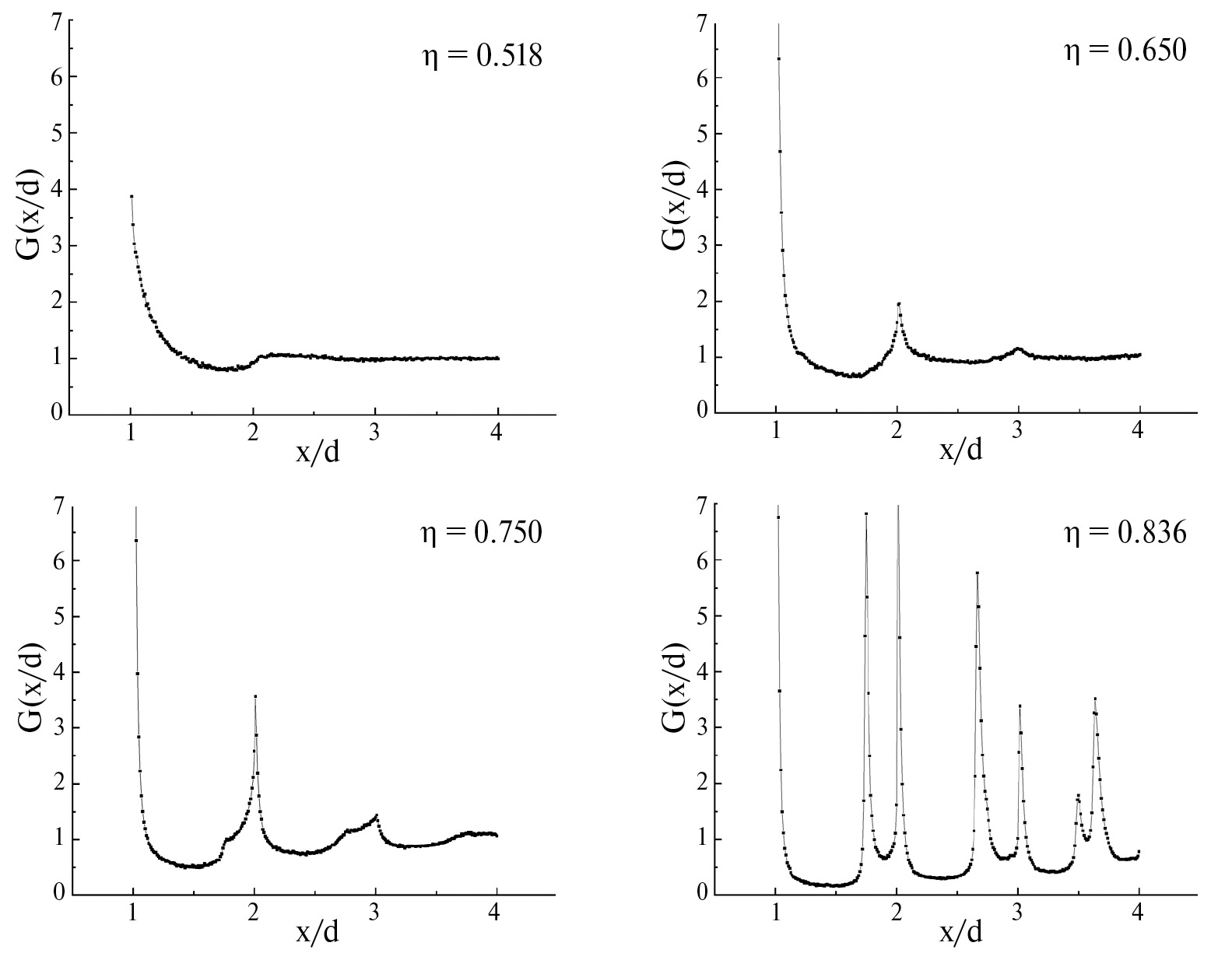 Рис. 6. Радиальные функции распределения для ансамбля жестких дисков при плотности упаковки η = 0.518 (а), 0.650 (б), 0.750 (в) и 0.836 (г).