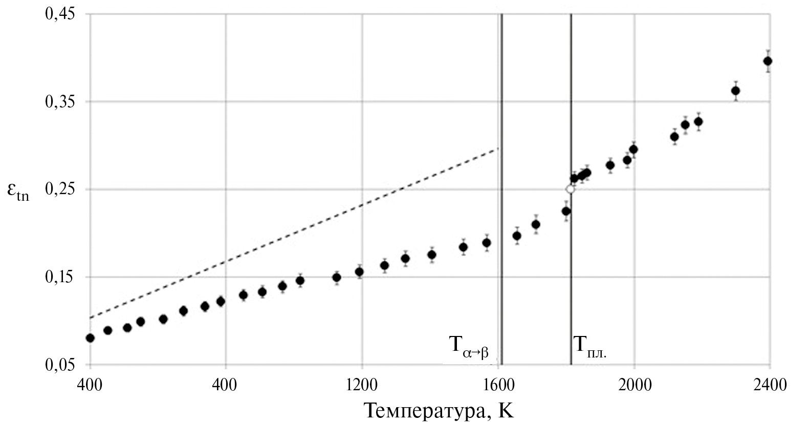 На основе данных по ρ [10], вычислительный эксперимент показал завышенные значения εtn для твердой фазы. Это, по мнению авторов, связано с упрощениями используемого приближения, игнорирующего особенности межатомных взаимодействий и поверхностных эффектов. Однако в точке фазового перехода значение, рассчитанное по данным ρ из [24], демонстрирует сходимость с экспериментальными данными в пределах погрешности измерений. Также единичное значение εtn в твердой фазе при температуре 1500 К, рассчитанное по ρ из [27], хорошо согласуется с экспериментом.