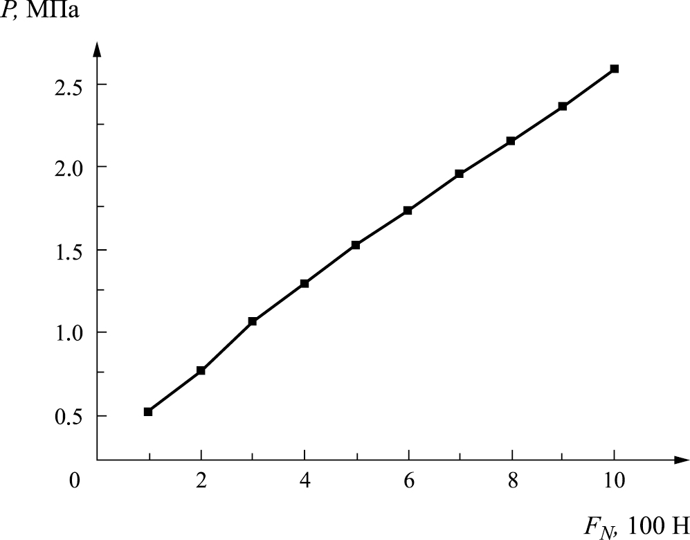 Рис. 5. Зависимость среднего давления в трибоконтакте от прикладываемой нагрузки FN.
