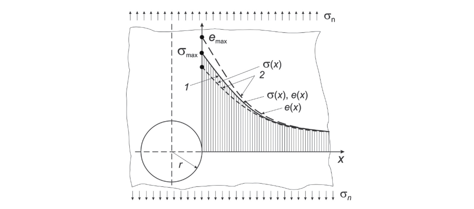По результатам выполненных исследований на рис. 1 (кривая 1) показано распределение и перераспределение напряжений σ(x) и деформации e(x) по опасному сечению х в бесконечной пластике с отверстием радиусом r при действии номинальных растягивающих напряжений σn.