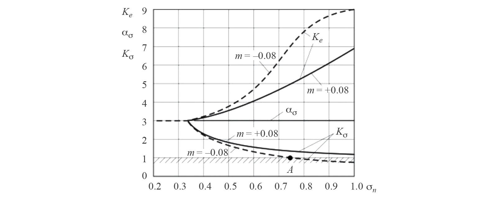 Принципиально новой и важной особенностью концентрации напряжений для разупрочняющегося материала (m = –0.08) является то обстоятельство, что в точке А при определенном уровне номинальных напряжений ( = 0.75 по рис. 4) величина Kσ становится равной единице, и при дальнейшем увеличении максимальные напряжения σmax в зоне концентрации по выражениям (7) и (8) оказываются меньше номинальных напряжений σn (). В этой связи общепринятые расчеты прочности в максимальных местных (локальных) напряжениях () теряют смысл. В таком случае для разупрочняющегося материала (при m ≤ 0) в упругопластической области при ≥ 1 / ασ научно обоснованным, более информативным и практически значимым становятся как расчет в максимальных местных деформациях () по деформационным критериям прочности и локальным деформациям, так и экспериментальные исследования локальных напряжений для объектов новой техники (атомная и термоядерная энергетика, ракетно-космические системы, высокорисковые объекты в экстремальных аварийных и катастрофических ситуациях).