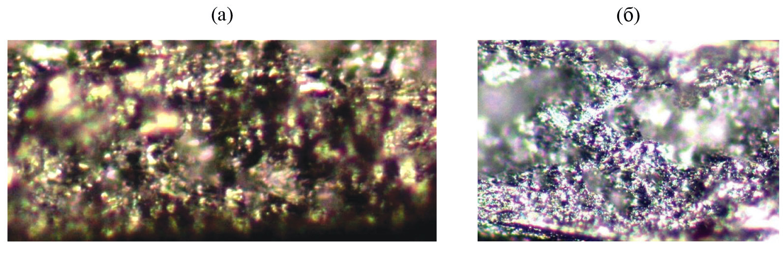 Рис. 2. Общий вид среза разреза образца из алюминиевого сплава марки 8011: (а) – без двустороннего УЗК упрочнения, с увеличением ×1000; (б) – после двустороннего УЗК упрочнения, с увеличением ×1000