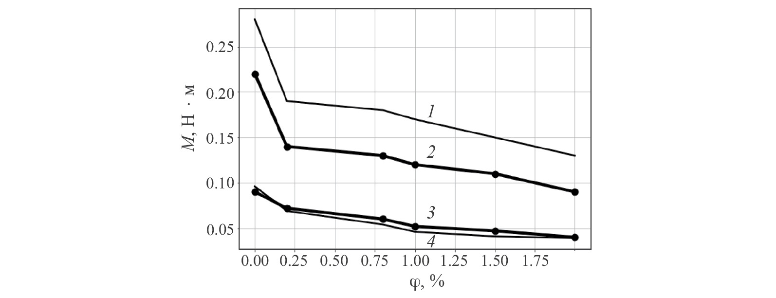 Рис. 3. Зависимость момента трения от концентрации фуллеренов: 1 – теоретические данные при нагрузке 80 Н; 2 – экспериментальные данные при нагрузке 80 Н; 3 – экспериментальные данные при нагрузке 200 Н; 4 – теоретические данные при нагрузке 200 Н