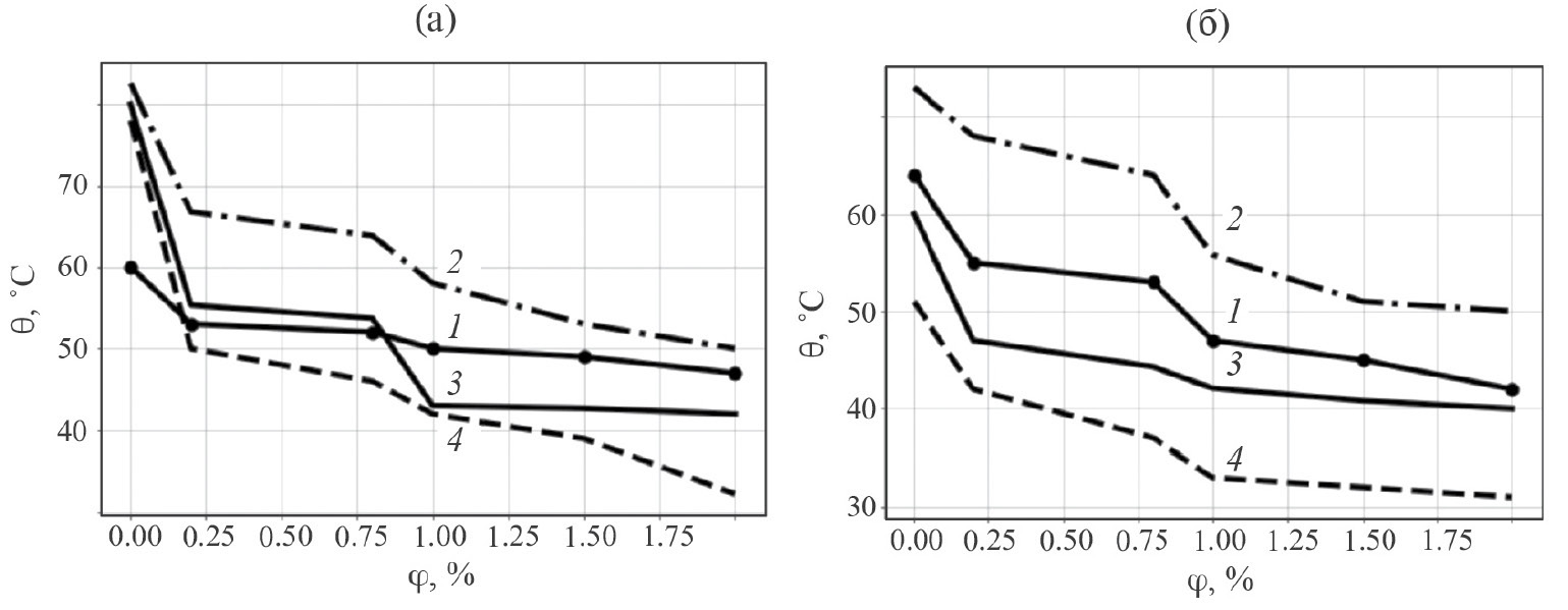 Рис. 4. Зависимость температуры смазочного слоя от концентрации фуллеренов: (а) – нагрузка 80 Н; (б) – нагрузка 200 Н; 1 – экспериментальные данные; 2 – температуры, рассчитанные математической моделью, построенной на основе модифицированного уравнения Рейнольдса с переменной вязкостью; 3 – температуры, рассчитанные моделью, построенной на основе уравнения Фурье; 4 – теоретические данные, рассчитанные моделью, построенной на основе энергетического баланса трения