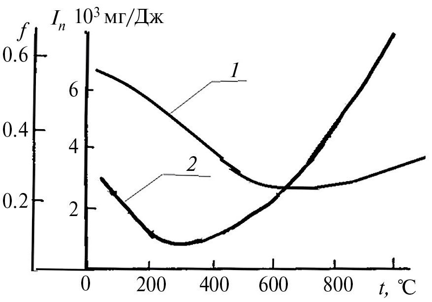 Сравнительный анализ графиков на рис. 2 показывает, что при повышении температуры в зоне контакта коэффициент трения падает и достигает минимального значения при температуре около 500°С. При дальнейшем повышении температуры коэффициент трения начинает увеличиваться, однако при этом ухудшаются физико-механические (прочностные) свойства взаимодействующих поверхностей. Примерно по такой зависимости изменяется интенсивность изнашивания Iи. Однако минимальное значение интенсивность износа достигает при температуре около 300°С.