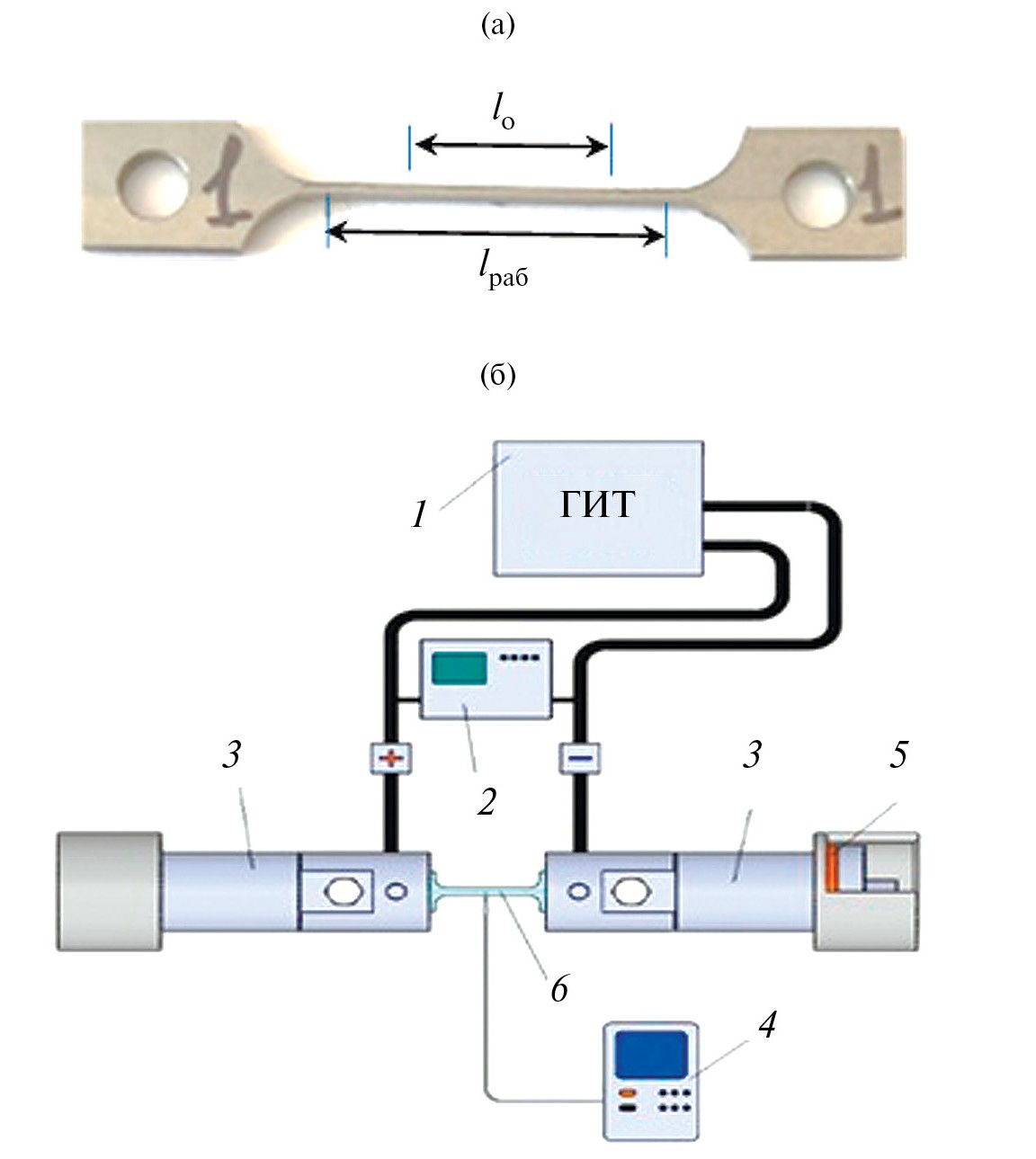 2. Fig. 1. View of a flat sample (a) and a diagram of the current supply to the terminals (b): 1 – pulse current generator; 2 – oscilloscope; 3 – sample; 4 – thermocouple; 5 – insulation; 6 – terminals of the testing machine.