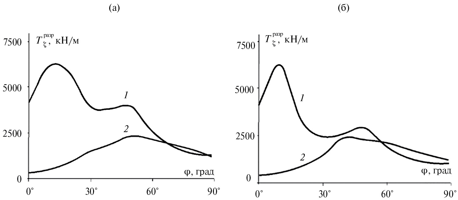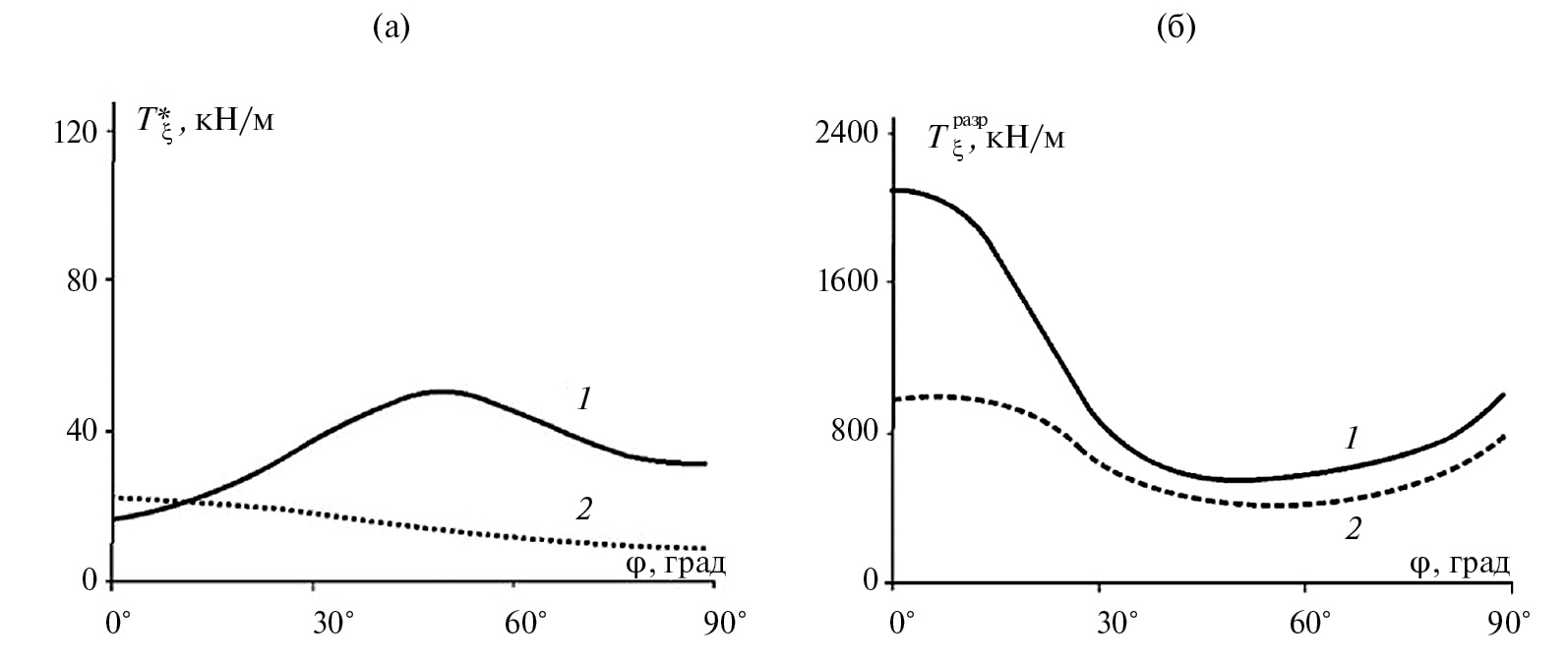 Рис. 4. Сравнение предельных усилий при сжатии 1 и сдвиге 2 по критерию сплошности материала: (а) – шарнирное опирание; (б) – смешанное опирание.