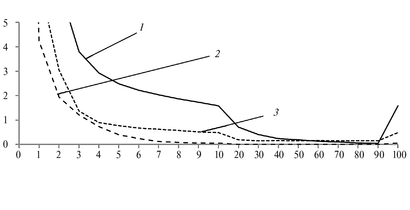 Рис. 2. Сравнительные результаты для ИС 140UD25A с другим коэффициентом k сокращения оценки усадки Джеймса–Штейна на стандартное отклонение значения целевой функции: 1 – нормализация по стандартному отклонению; 2 – нормализация по значениям допустимого дрейфа; 3 – по допустимым значениям параметров.