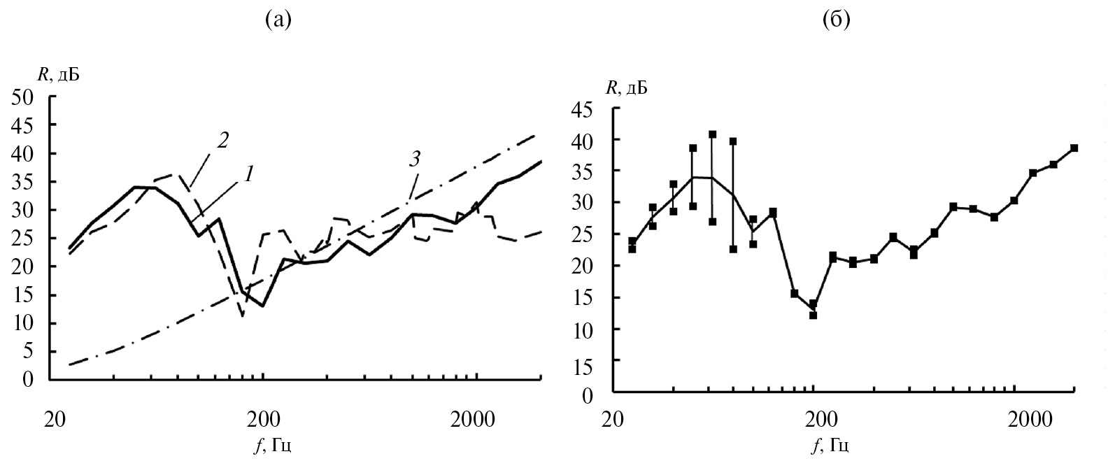 Рис. 4. Результаты расчетов: (а) – звукоизоляционные характеристики: 1 – экспериментальная панель; 2 – закон масс для экспериментальной панели; 3 – оснастка; 4 – закон масс для оснастки; (б) – оценка погрешности: 1 – ограничение в 1 дБ; 2 – погрешность эксперимента; 3 – разность звукоизоляции экспериментальной оснастки и звукоизоляции экспериментальной па