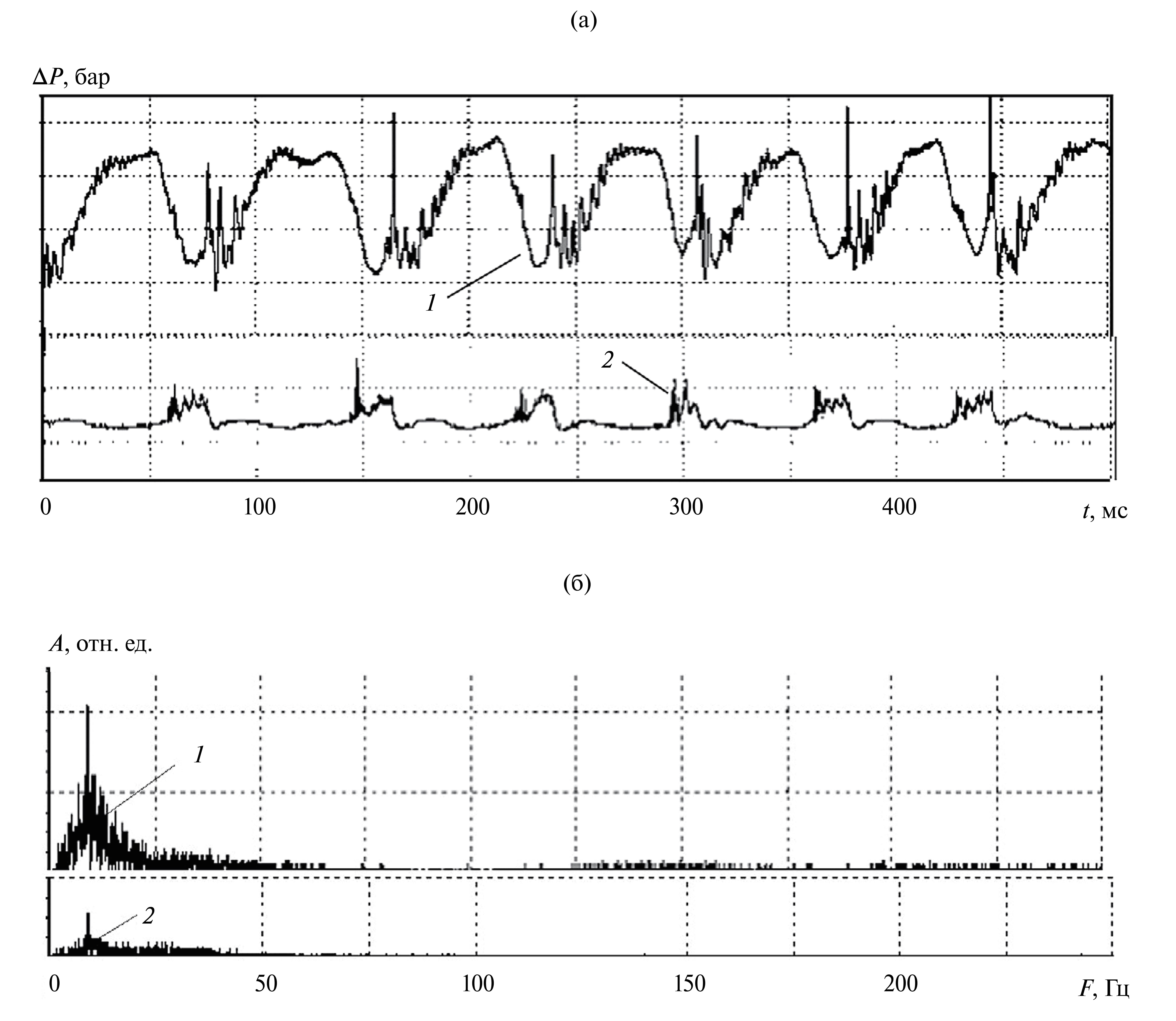 Рис. 3. (а) – Кривые колебаний давления ΔР на выходе устройства 1 и в магистрали воды 2; (б) – их спектры соответственно 1 и 2; А – амплитуда колебаний. Цена деления по вертикали на рис. 3а составляет 2 бара.