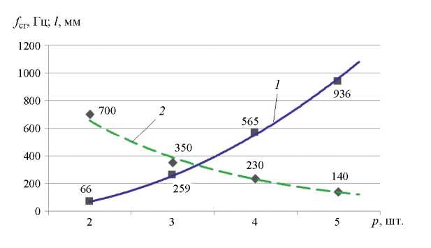 Рис. 6. Зависимости собственной частоты fcr (кривая 1) и межопорного пролета для трехзаходного шнека l (кривая 2) от числа шарнирных опор p.