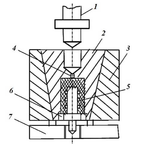 Рис. 3. Пресс-форма с вертикальным разъемом: 1– пуансон; 2 — матрица; 3 — обойма; 4 — центральное литниковое отверстие; 5 — металлическая арматура; 6 — наплечники; 7 — основание.