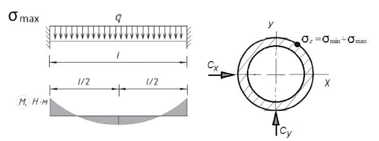 При воздействии гидродинамических сил труба деформируется и возникают упругие напряжения. Для расчета этих напряжений представим трубу в виде балки круглого сечения с тонкой стенкой и защемленной на концах.