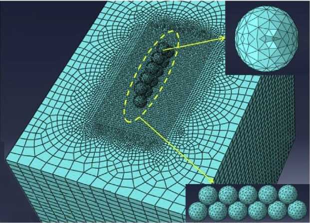 Конечно-элементное моделирование технологии ИНЛУВ. В качестве материала подложки (матрицы) используется алюминиевый сплав АД1. Для моделирования процесса имплантации наночастиц в поверхностный слой алюминиевого сплава АД1 с помощью технологии ИНЛУВ используется метод конечных элементов (МКЭ), в частности, программный комплекс ABAQUS. При моделировании принята кубовидная 3D-осесимметричная модель, в которой на поверхностном слое в центральной области выбрана сетка с высокой плотностью (рис. 1). WC-наночастицы со средним диаметром 50–100 нм, считаются жесткими шариками, они располагаются на поверхности в два слоя. В разработанной модели к наночастицам прикладывается давление, образованное лазерной ударной волной, вследствие чего им сообщается определенная начальная скорость. Расположение наночастиц схематически показано на рис. 1. Имитационная модель состоит из 196611 конечных элементов типа C3D8R для алюминиевого сплава АД1 и 1263 элементов типа C3D4 для WC-наночастиц. По границам подложки накладываются симметричные граничные условия (жесткое защемление). Более детально особенности создания конечно-элементной модели изложены в [12].