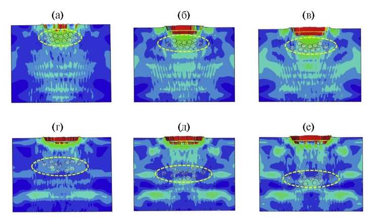 Рис. 3. Конечные расположения WC-наночастиц при разных режимах ИНЛУВ и при различных энергиях лазерного импульса: (а) — ИНЛУВ-1 и 6 Дж; (б) — ИНЛУВ-1 и 9 Дж; (в) — ИНЛУВ-1 и 12 Дж; (г) — ИНЛУВ-2 и 6 Дж; (д) — ИНЛУВ-2 и 9 Дж; (е) — ИНЛУВ-2 и 12 Дж.