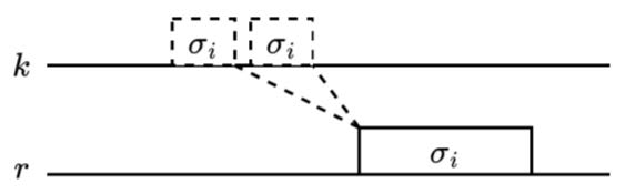 В настоящей работе в качестве критерия оптимизации размещения вида (2) рассматривается потенциальная загрузка агрегатов подготовки требований. Такой подход связан с тем, что практические задачи размещения требований, как правило, рассматриваются отдельно от задач назначения подготовительных агрегатов и последующих машин обработки. Так, в частности, время начала выполнения требования σi на машине r выступает входными данными и фиксировано для задачи о назначении агрегатов подготовки (рис. 3 (пунктирной линией обозначены возможные варианты назначения агрегата k для подготовки фиксированного требования σi)).