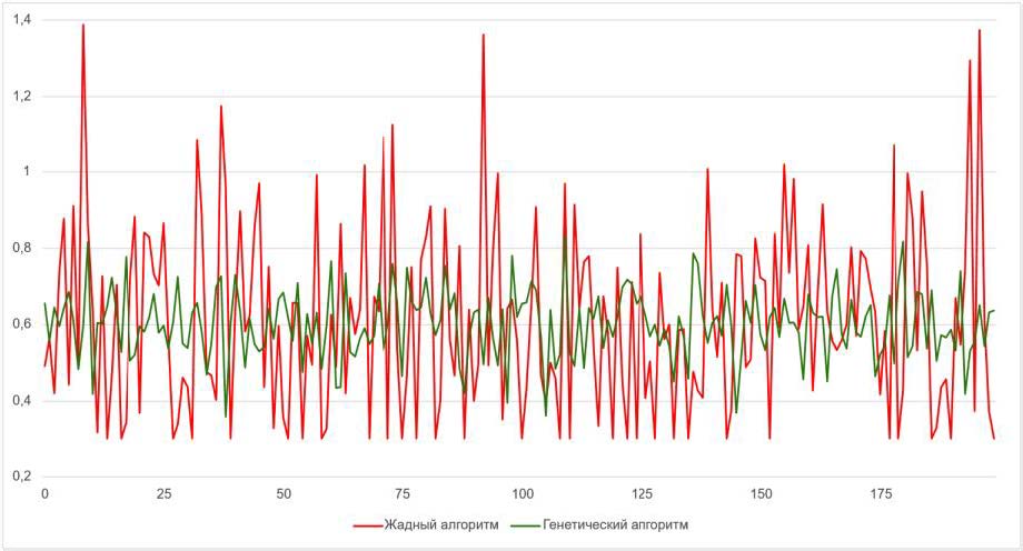 В примере на графике значение максимума потенциальной нагрузки на подготовительные агрегаты (6) составляет 1,39 и 0,83 для жадного и генетического алгоритмов соответственно. Аналогичные расчеты были проведены для каждого экземпляра входных данных в рассматриваемом годовом периоде. Результаты сравнительного анализа по критерию (6) представлены на графике (http://www.swsys.ru/uploaded/image/2025-1/25.jpg).