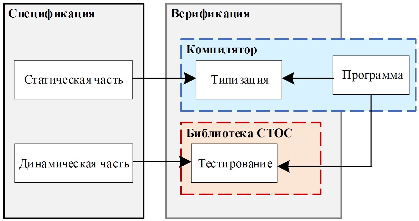 Сформулируем общую схему процесса верификации, приведенную на рисунке. В зависимости от выразительности системы типов заданного языка программирования полная спецификация программы или ее часть может быть представлена соответствующими ти́повыми конструкциями и полностью верифицирована средствами статической типизации. Статическая верификация может потребовать дополнительной работы по написанию доказательств, которые будут проверены компилятором. Часть спецификации программы, не поддающаяся статической верификации, может быть представлена с использованием системы СТОС в виде свойств и протестирована динамически [13]. Динамическая верификация не требует дополнительного труда со стороны программиста, но при этом является частичной. В языках с выразительной системой типов, таких как Coq, возможно представление всей спецификации в виде ти́повой конструкции, однако по решению программиста она может быть частично верифицирована статически, а частично динамически (например, при недостатке временных ресурсов для разработки полноценных доказательств или для быстрого опровержения спецификации с целью ее дальнейшего уточнения). В языках с отсутствующими или менее выразительными системами типов динамическая часть спецификации должна формулироваться отдельно средствами библиотеки СТОС.