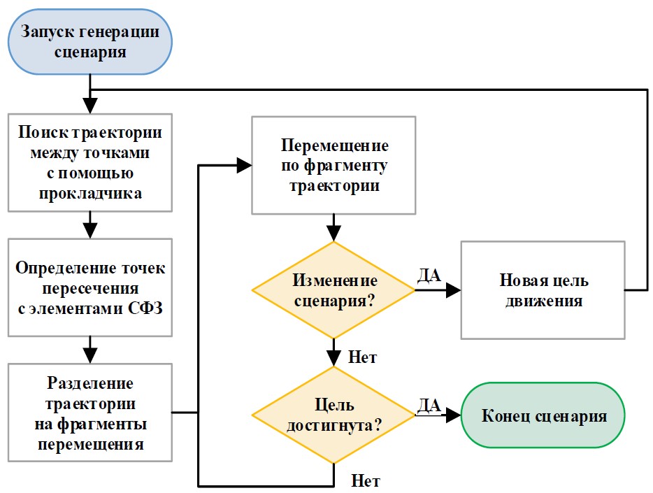 Алгоритм формирования событийно-управляемых траекторий расставляет случайные события на локальном отрезке пути, и возникает событийно-управляемая траектория, формируемая с помощью гибридных автоматов. Это позволяет автоматически строить динамические сценарии экспериментов и исключать необходимость привлечения эксперта на этапе подготовки модели СФЗ. Случайные события влияют на выбор агентом очередной достижимой точки (смена локального отрезка пути под воздействием событий), что вносит случайные изменения в сценарий.